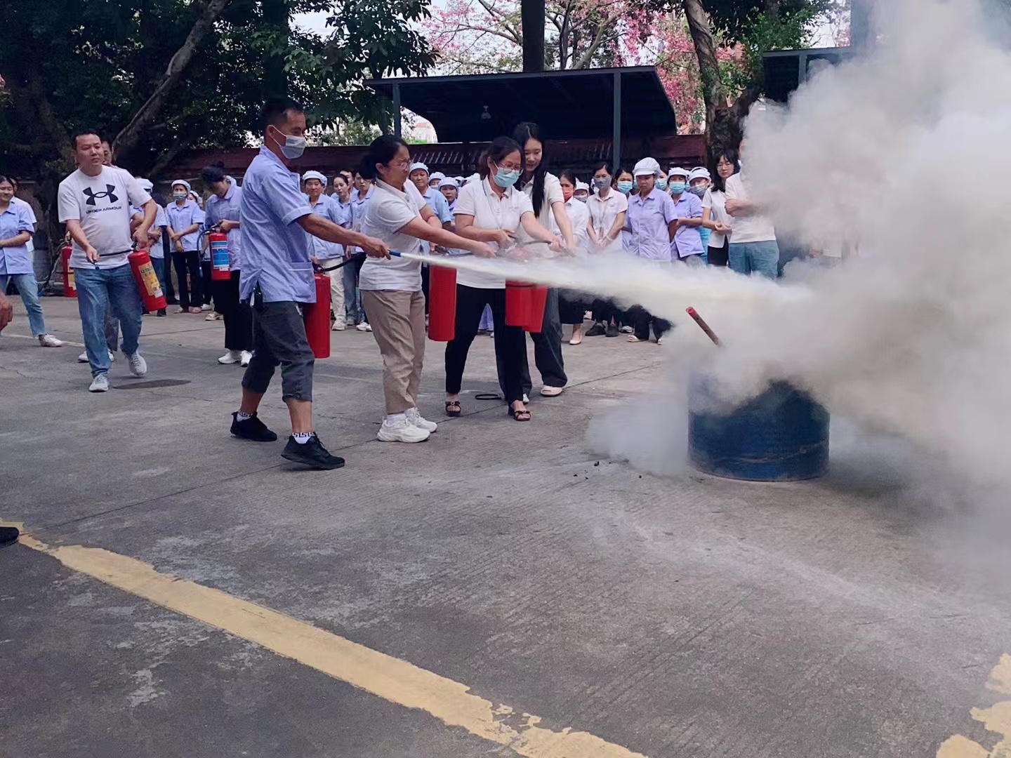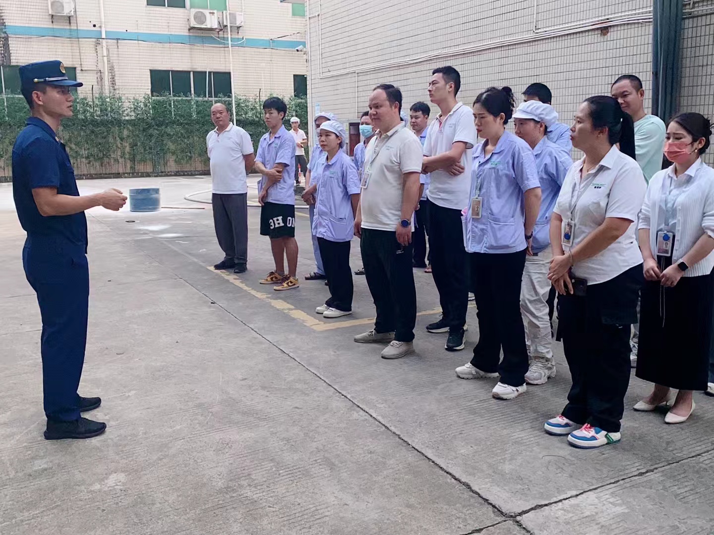 隨著煙霧彌漫,警報聲驟然響起,雅香麗員工立即用手捂口鼻,快速有序地通過安全出口,逃離“火場”至安全地帶。隨后,消防車趕到現(xiàn)場,消防官兵迅速連接水帶、噴水槍,進(jìn)入工廠內(nèi)部實施撲救。
